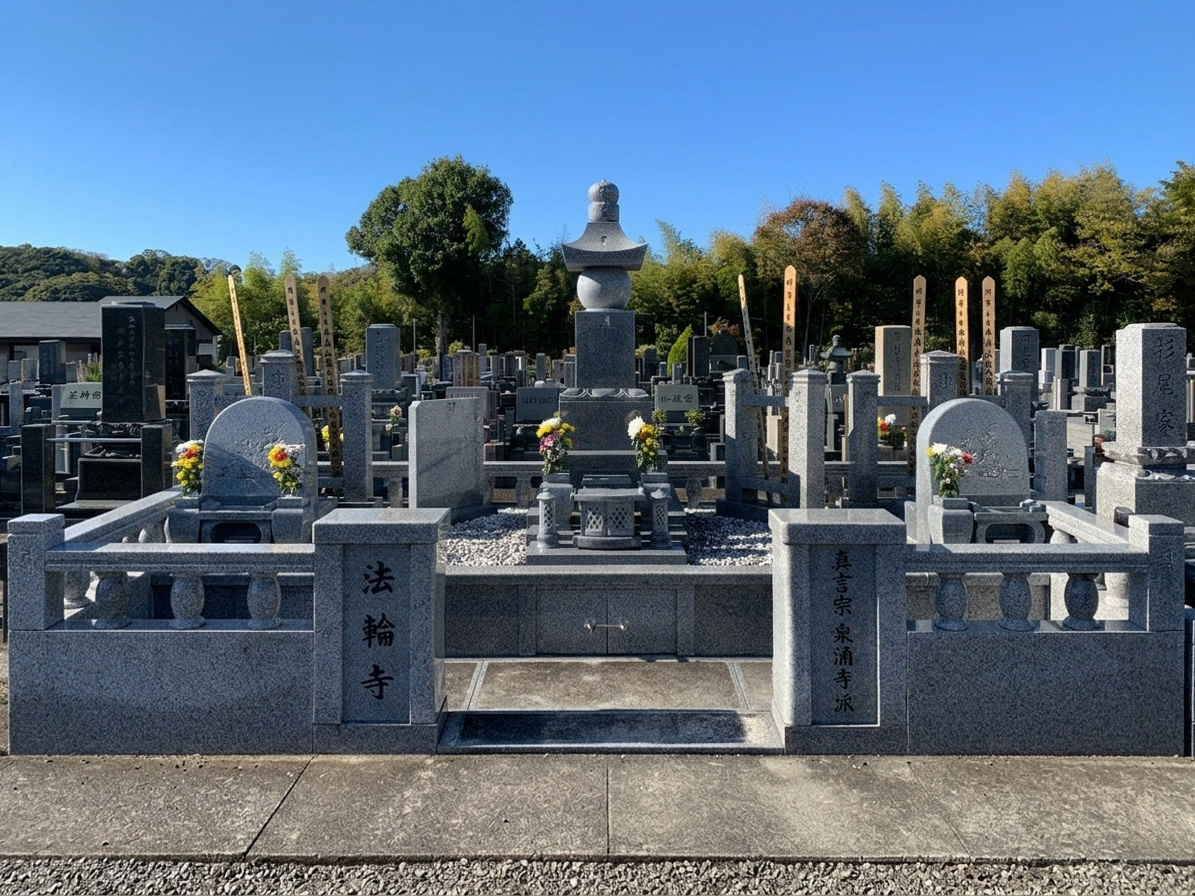 法輪寺の合祀墓は、中央に五輪塔を安置し、その両脇に二基の合祀区画を備えた